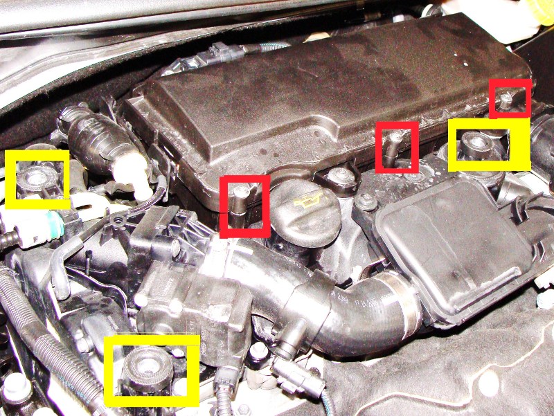 Les vis captives entourées en rouge (en jaune les supports du cache moteur):