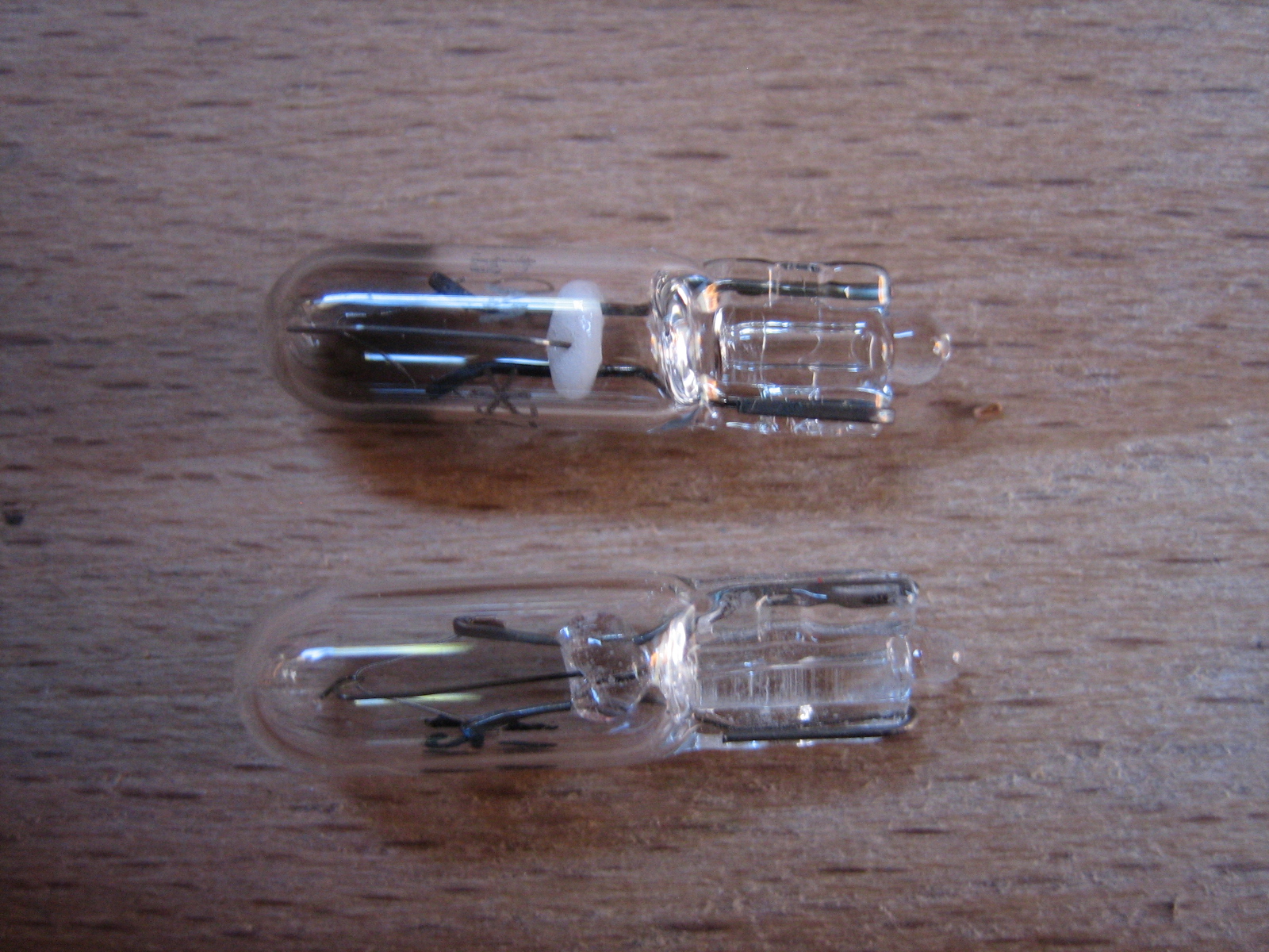 Ampoule HS en haut et ampoule neuve en bas, elle est légèrement plus grande mais ça rentre, j'ai mis une ampoule de 1w au lieu de celle d'origine qui est une 1,2w.